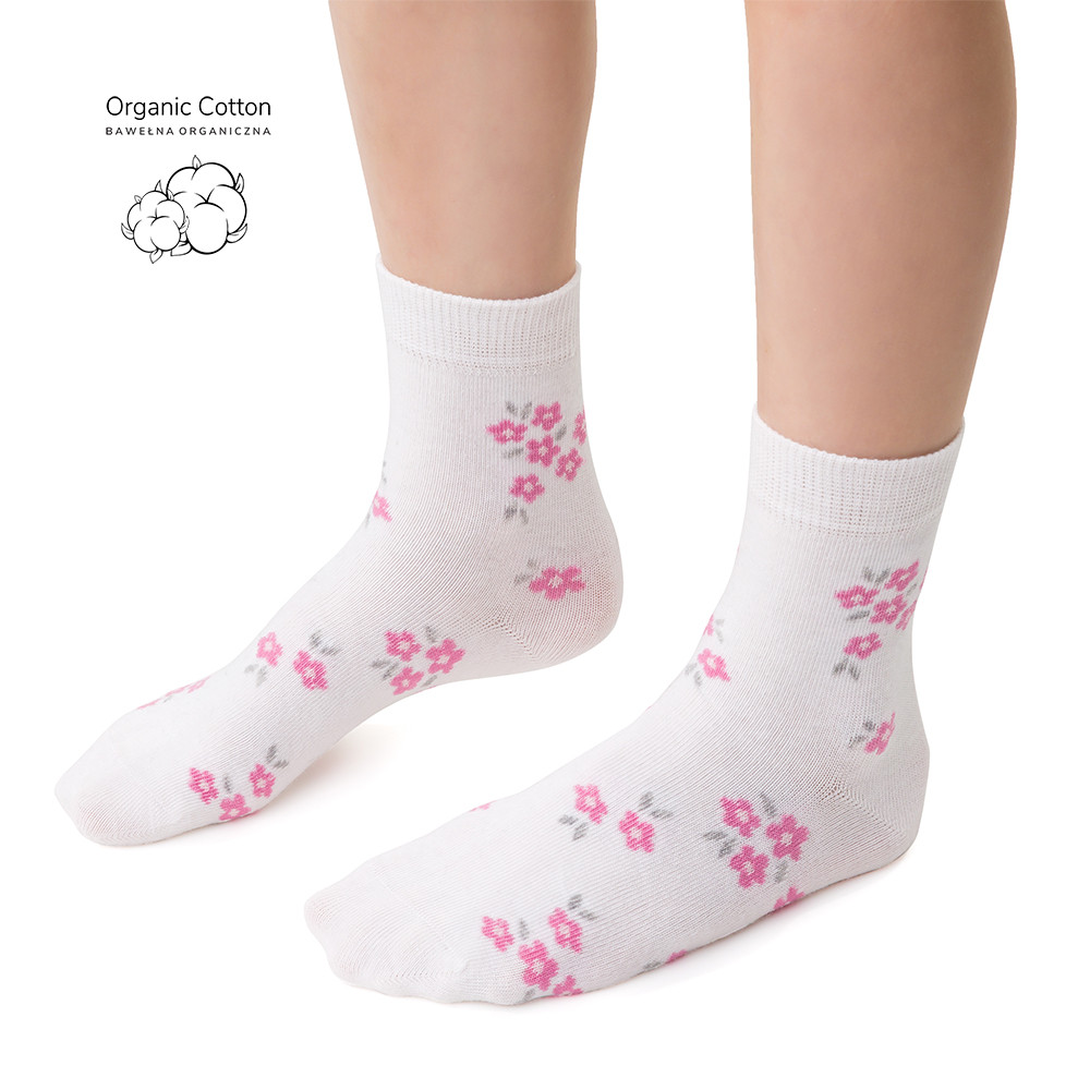 Delikatne, miękkie i w pełni bezpieczne dla wrażliwej skóry dziecka. Wykonane z certyfikowanej bawełny organicznej, są hipoalergiczne, oddychające i wolne od szkodliwych substancji. Przyjemny w dotyku materiał z kolorowym wzorem w kwiatki sprawia, że skarpetki nie tylko świetnie wyglądają, ale też są wygodne przez cały dzień. Delikatny ściągacz utrzymuje je na miejscu, nie powodując ucisku.