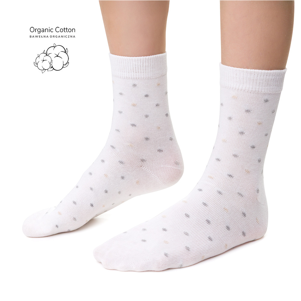 Delikatne, miękkie i w pełni bezpieczne dla wrażliwej skóry dziecka. Wykonane z certyfikowanej bawełny organicznej, są hipoalergiczne, oddychające i wolne od szkodliwych substancji. Przyjemny w dotyku materiał z kolorowym wzorem w kropki sprawia, że skarpetki nie tylko świetnie wyglądają, ale też są wygodne przez cały dzień. Delikatny ściągacz utrzymuje je na miejscu, nie powodując ucisku.