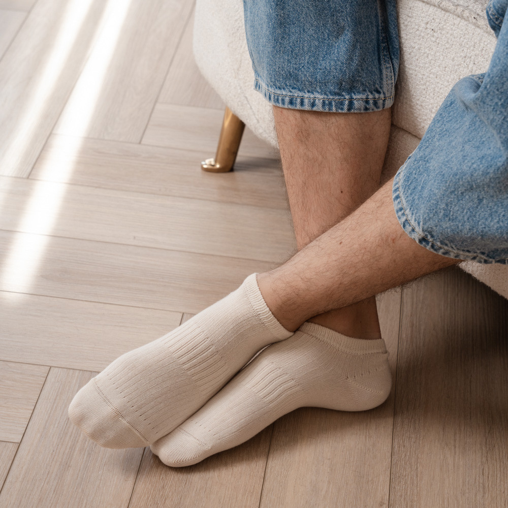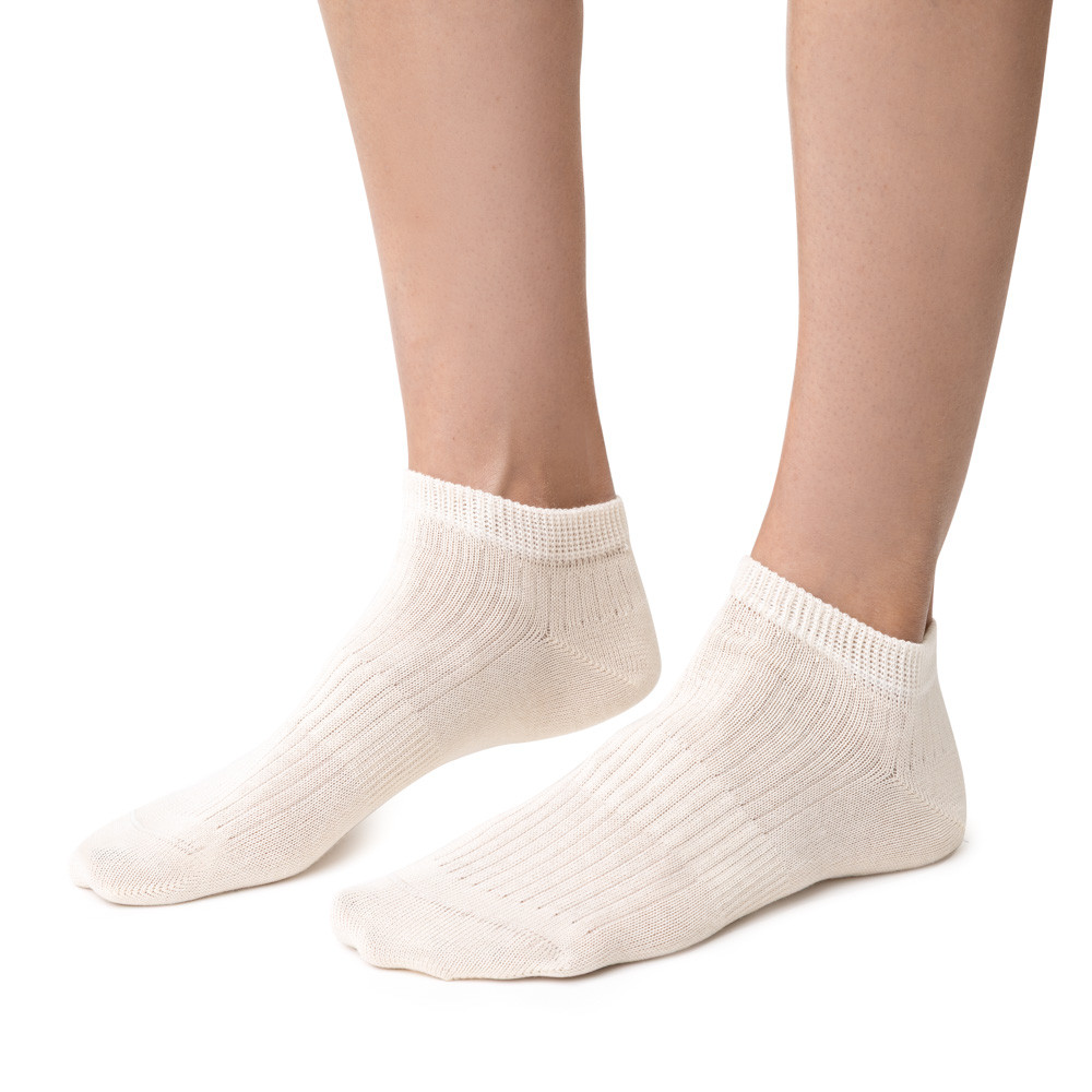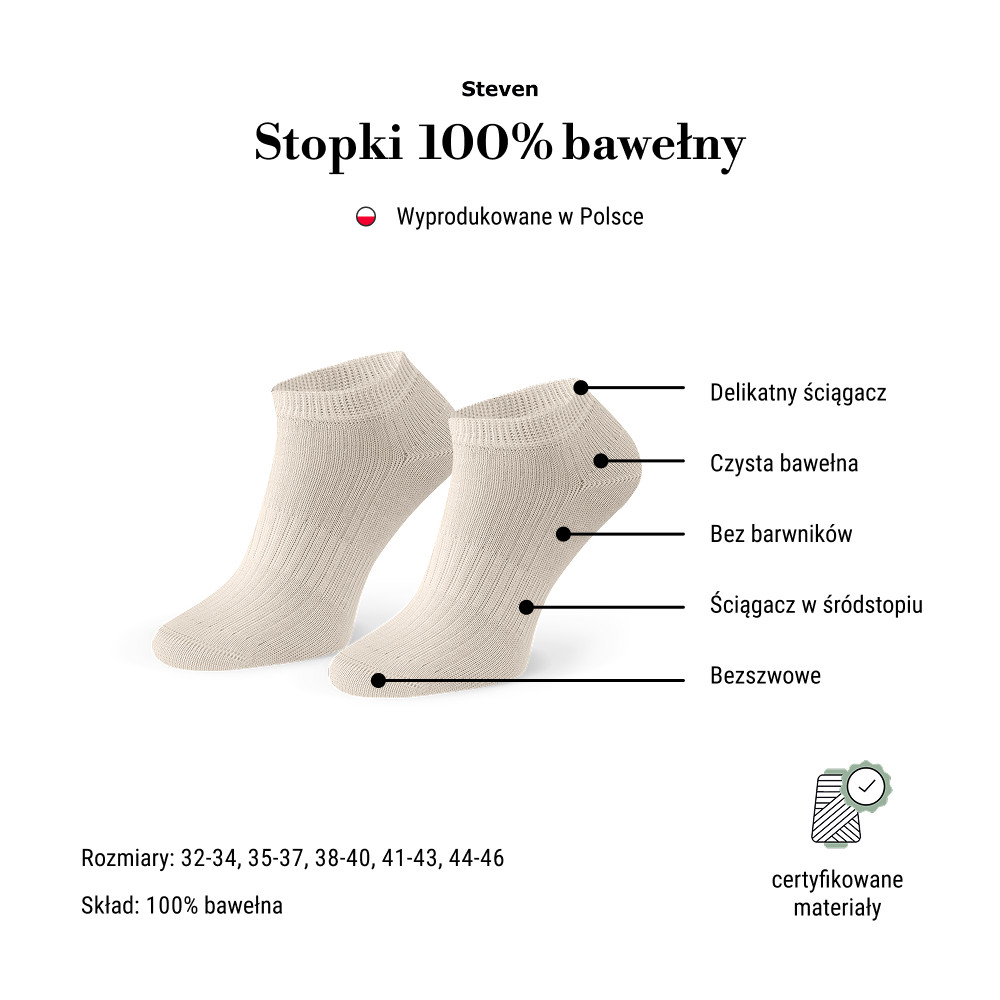 Stopki wykonane w 100% z czystej, certyfikowanej bawełny (certyfikat przędzy: OEKO-TEX STANDARD 100) powstały z myślą o osobach, które zmagają się z problemami dermatologicznymi. Komfort noszenia zapewnia bezszwowe wykończenie, a delikatny ściągacz w śródstopiu stabilizuje stopki na nodze, zapobiegając ich zsuwaniu. Produkt jest wolny od sztucznych barwników, substancji chemicznych i środków zapachowych, co zapewnia naturalną pielęgnację stóp. Idealne na co dzień – lekkie, w naturalnym kolorze, przed kostkę.