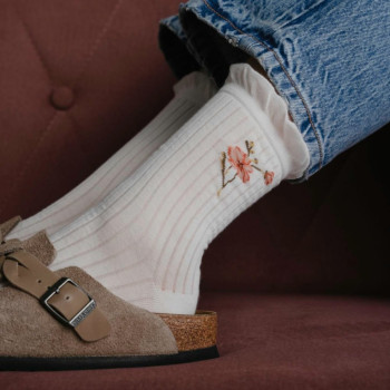Skarpetki ecru w kwiatki z falbanką