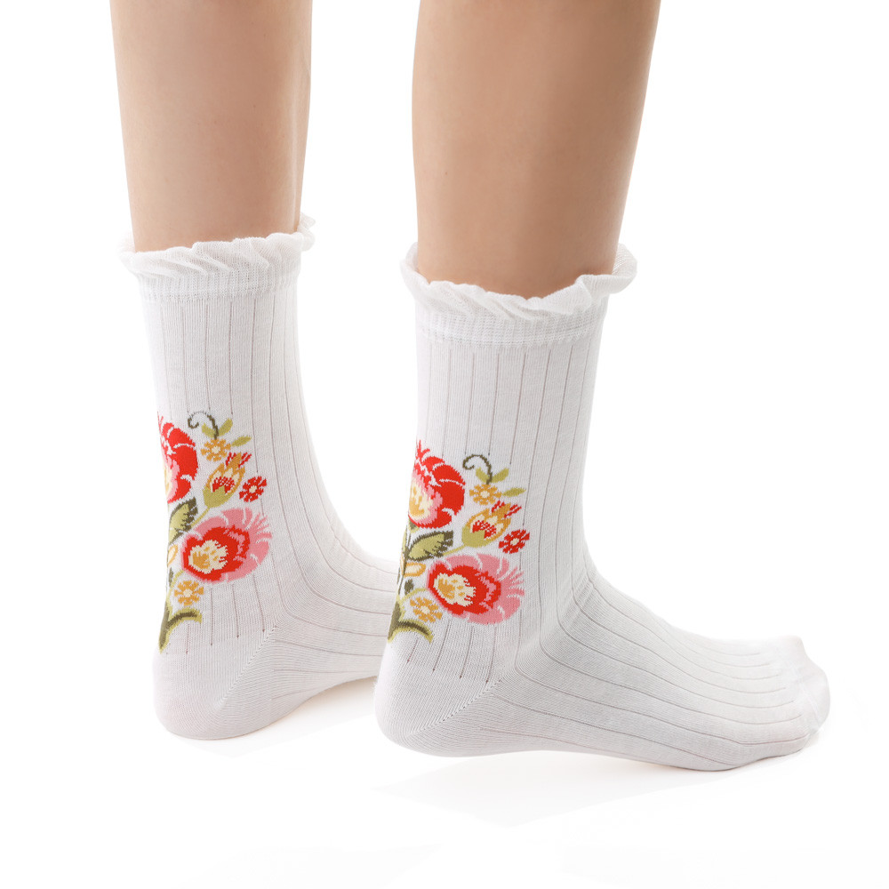 Wyjątkowe skarpetki w delikatny prążek, uszyte z miękkiej, oddychającej bawełny, z uroczą falbanką w ściągaczu i kolorowym motywem kwiatowym zainspirowanym wycinanką łowicką umieszczonym subtelnie z tyłu – nad kostką. To idealne połączenie klasycznej wygody z polskim folklorem – stylowy detal, który ożywi każdą stylizację. Skarpetki doskonale sprawdzą się zarówno do codziennych looków, jak i jako uroczy akcent przy bardziej eleganckim obuwiu.
