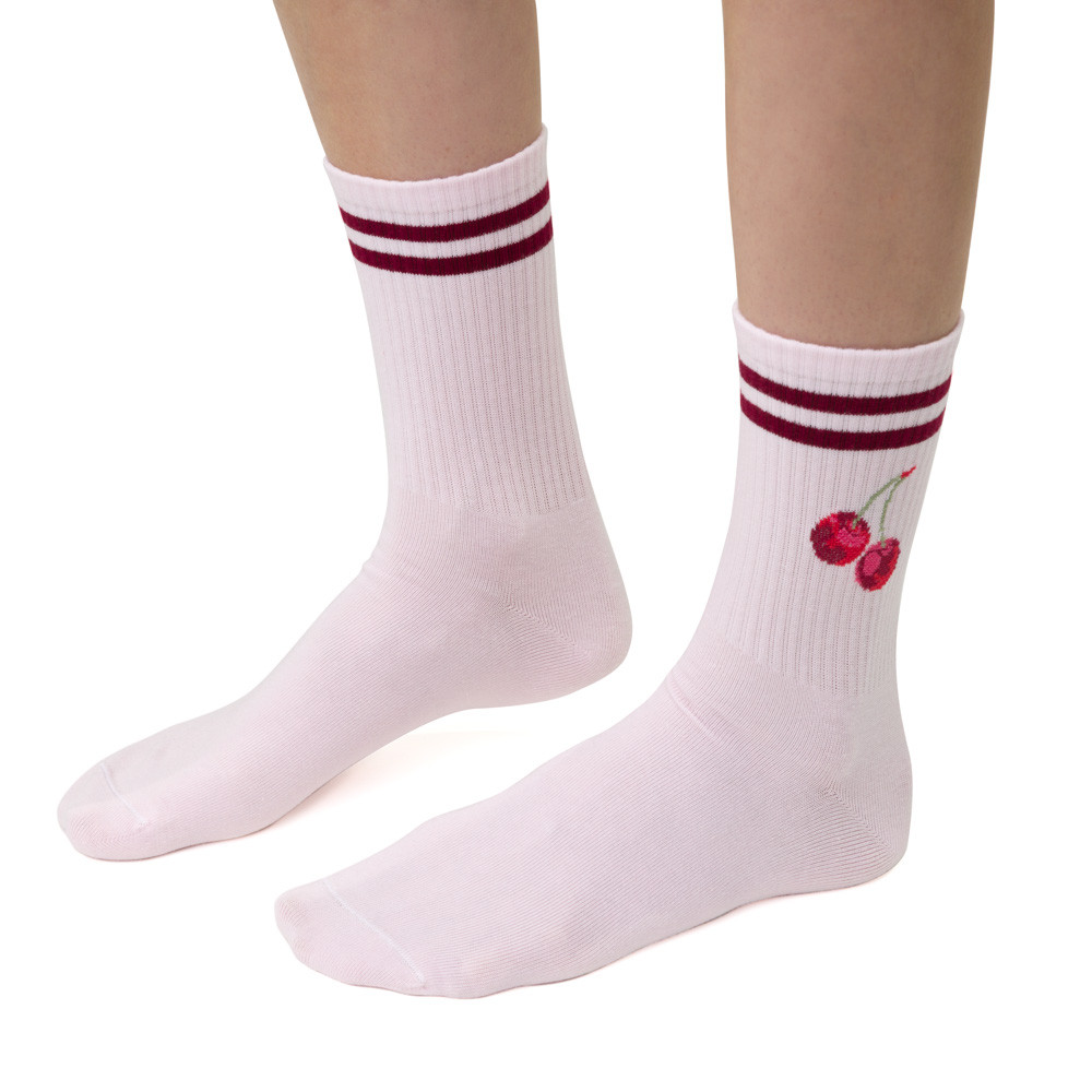 Odkryj wyjątkowe jasnoróżowe skarpetki damskie z dwoma stylowymi paskami i uroczym motywem wisienek! Wykonane w 70% z bawełny, zapewniają przewiewność i komfort noszenia przez cały dzień. Ich sportowy ściągacz doskonale dopasowuje się do stopy, nie uciskając jej, dzięki czemu są idealnym wyborem zarówno na trening, jak i do codziennych stylizacji. Dodaj swoim stylizacjom odrobinę uroku i wygody!