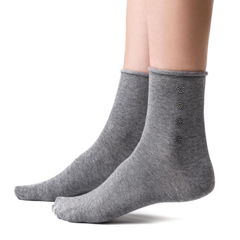 Te damskie skarpetki bawełniane zostały ozdobione subtelnymi, błyszczącymi kamykami, które pięknie odbijają światło i nadają całości elegancki charakter. To idealny wybór dla kobiet, które cenią wygodę, ale lubią też wyróżniać się stylowymi detalami.