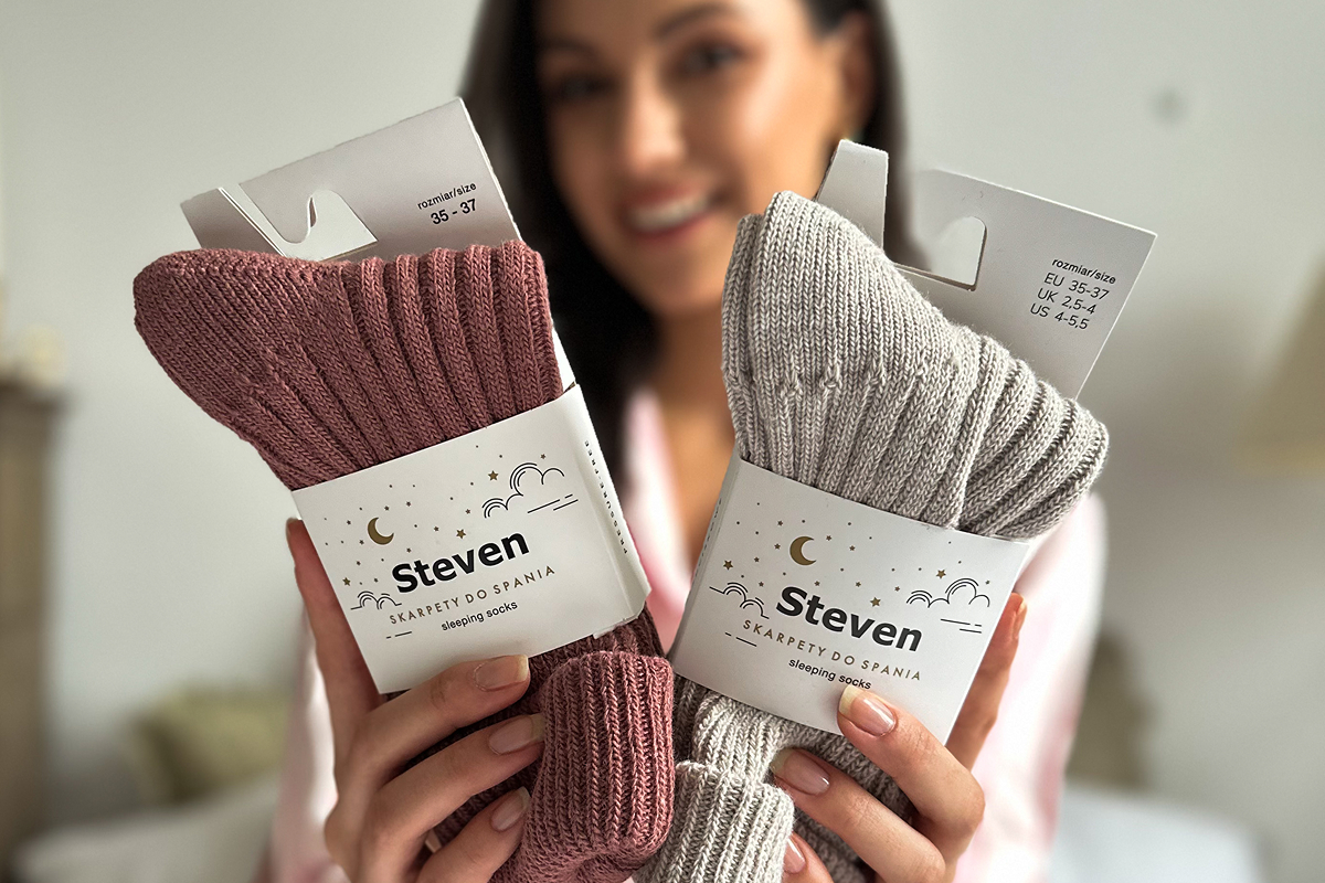 Skarpetki do spania Steven mają wyższy bezuciskowy ściągacz, który nie zaburza krążenia, a jednocześnie utrzymuje skarpetkę na miejscu. Ich lekka i miękka struktura sprawia, że są przyjemne w dotyku, nie drapią i nie powodują dyskomfortu nawet podczas długiego snu. Dzięki temu są doskonałym wyborem zarówno na chłodniejsze zimowe wieczory, jak i na relaks w domu po długim dniu.