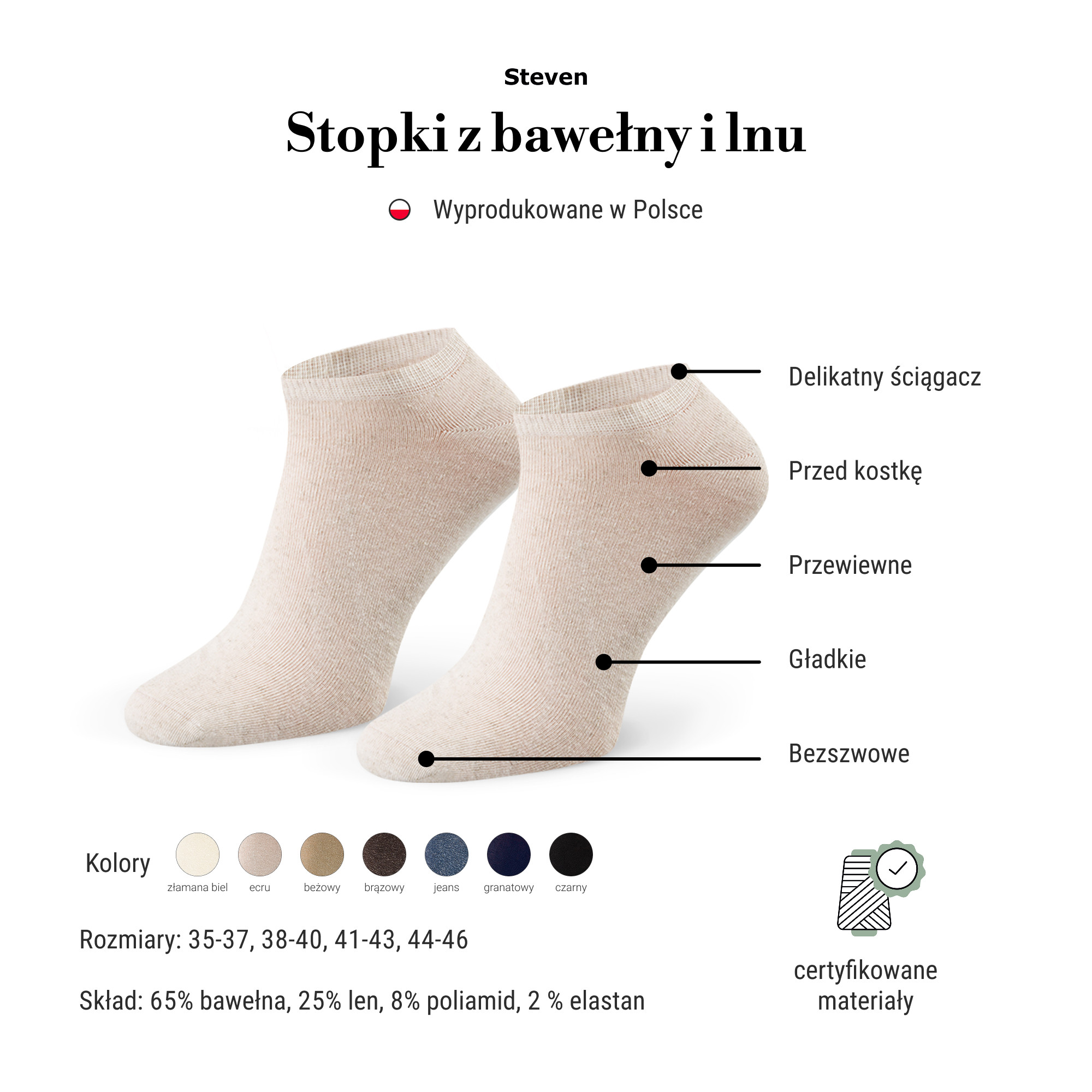 Stopki z lnu (25%) i bawełny (65%) zostały zaprojektowane z myślą o twoim komforcie. Bezszwowe wykończenie gwarantuje brak otarć, co sprawia, że są idealnym wyborem na lato. Wykonane z mieszanki naturalnych włókien lnu i bawełny, zapewniają doskonałą przewiewność, odprowadzanie wilgoci oraz uczucie świeżości. Dzięki swojej uniwersalności stanowią doskonały dodatek do każdej letniej stylizacji. Konstrukcja produktu oparta na włóknach poliamidowych (8%) daje wyjątkową trwałość, natomiast elastan (2%) gwarantuje elastyczność i idealne przyleganie do stopy.