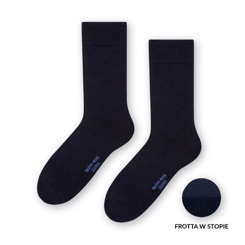 Skarpety półfrotte wykonane z wełny merynosów (77%) to produkt idealny na sezon jesienno-zimowy. Utrzymują nieprzyjemne dla bakterii środowisko. Dobrze odprowadzają wilgoć. Klasyczny model pasuje do codziennych stylizacji, a komfort noszenia zapewnia bezszwowe łączenie oraz frotta pod stopą. Konstrukcja produktu oparta na włóknach poliamidowych (21%) daje wyjątkową trwałość, natomiast elastan (1,5%) gwarantuje elastyczność i idealne przyleganie do stopy.
