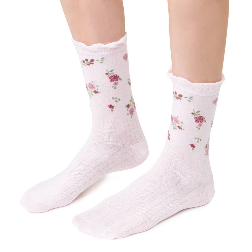 Skarpetki jasnoróżowe w kwiatki z falbanką