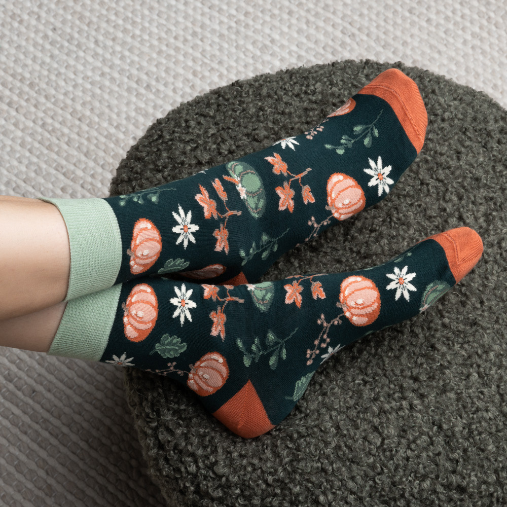 Miękkie i elastyczne skarpetki o klasycznej długości, ozdobione delikatnym kwiatowym wzorem, to harmonijne połączenie natury i subtelnej elegancji. Inspirowane niezwykłym bogactwem flory, odzwierciedlają zmienność i piękno, jakie każdego dnia oferuje nam Planeta Ziemia. Szukasz drobnego akcentu, który wprowadzi Cię w jesienny nastrój? Nasze beżowe skarpetki z uroczym motywem dyni to idealny wybór!