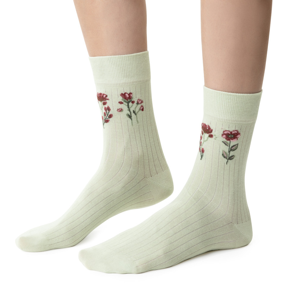 Miękkie i elastyczne skarpetki o klasycznej długości, ozdobione delikatnym kwiatowym wzorem, to harmonijne połączenie natury i subtelnej elegancji. Inspirowane niezwykłym bogactwem flory, odzwierciedlają zmienność i piękno, jakie każdego dnia oferuje nam Planeta Ziemia.