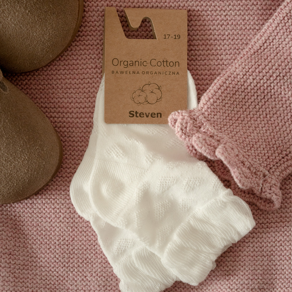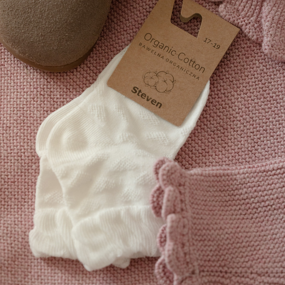 Skarpetki z bawełny organicznej z delikatną falbanką w ściągaczu łączą wyjątkowy komfort z naturalnymi właściwościami. Bawełna organiczna jest delikatna dla skóry dziecka, hipoalergiczna i wolna od szkodliwych substancji. Skarpetki zapewniają doskonałą cyrkulację powietrza, zapobiegając przegrzewaniu się stóp. Komfort noszenia. Dostępne w kilku kolorach.