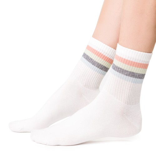 Sportowe skarpety z delikatnej bawełny (69%) gwarantują wygodę przez cały aktywny dzień. Idealne dla osób ceniących sobie praktyczność oraz komfort. Design dopasowany do sportowych stylizacji. Konstrukcja produktu oparta na włóknach poliamidowych (27%) daje wyjątkową trwałość, natomiast elastan (4%) gwarantuje elastyczność i idealne przyleganie do stopy.