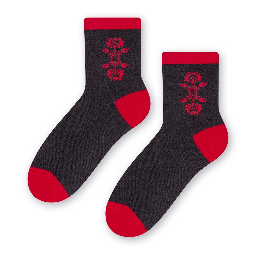 Delikatne, wygodne i subtelnie wyjątkowe — nasze bawełniane skarpetki damskie inspirowane wzorem łowickim to idealne połączenie tradycji z nowoczesnym stylem. Utrzymane w stonowanej kolorystyce, ozdobione drobnym motywem kwiatowym nad kostką w stylu łowickiej wycinanki, wprowadzają do codziennych stylizacji nutę folkloru w eleganckim wydaniu. Świetnie sprawdzą się zarówno do miejskich looków, jak i jako delikatny akcent przy bardziej klasycznych zestawieniach.