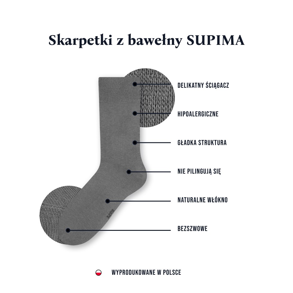 Bawełna supima to najwyższej jakości rodzaj bawełny uprawianej w USA. Stanowi mniej niż 1% bawełny uprawianej na świecie. To, co wyróżnia supimę spośród innych bawełn, to wyjątkowo długie włókna, które nadają bawełnie jej doskonałe właściwości: wytrzymałość, miękkość i trwałość koloru. Supima jest dwa razy mocniejsza od zwykłej bawełny, co sprawia, że produkty są niezwykle wytrzymałe. Dłuższe włókno jest odporne na mechacenie, pękanie i rozrywanie, co skutkuje produktami modowymi i domowymi, które są niesamowicie wytrzymałe i zachowują swój kształt, zapewniając produkt o dłuższej żywotności. Supima jest z natury bardziej miękka i luksusowa, ponieważ ma cieńsze, mocniejsze i dłuższe włókno, co pozwala na mniejszy skręt i lepszą wydajność. Jej ekstra długie włókno włókniste mierzy 3,8 cm w porównaniu do 2,5 cm zwykłej bawełny. Oznacza to, że Twoje produkty będą cudownie miękkie i z czasem staną się jeszcze bardziej miękkie. Drobniejsze włókna Supima lepiej wchłaniają barwnik, zapewniając głębszą, długotrwałą penetrację. Rezultatem jest produkt, który lepiej zachowuje kolor niż zwykła bawełna. Oznacza to, że produkty Supima zachowują swój blask po każdym praniu, zapewniając wiele lat użytkowania. Do jej uprawy używa się najnowszych technologii m.in. nowoczesny monitor gleby (nawadniania, składu) czy też technologii satelitarnej (topografi), a także nawigacji GPS w traktorach do sadzenia i zbioru. Dzięki tym metodom możliwe jest otrzymanie włókna o najwyższej jakości przy zachowaniu procesu najbardziej ekologicznego. Odkryj luksus i komfort w najlepszym wydaniu! Nasze męskie skarpetki garniturowe wykonane z bawełny Supima to synonim elegancji, trwałości i wyjątkowej miękkości. Bawełna Supima, uznawana za jedną z najwyższej jakości na świecie, zapewnia niezwykłą wytrzymałość i odporność na mechacenie, a jednocześnie jest niezwykle delikatna dla skóry. Te skarpetki to doskonały wybór dla mężczyzn ceniących styl, wygodę i najwyższą jakość. Sprawdzą się zarówno w biurze, na ważnych spotkaniach, jak i podczas eleganckich okazji. Wybierz klasykę, która nigdy nie wychodzi z mody!