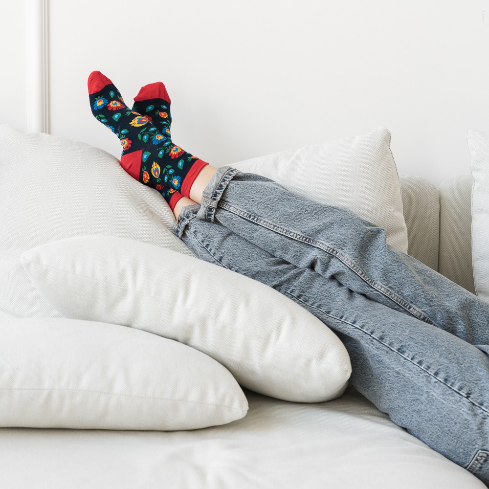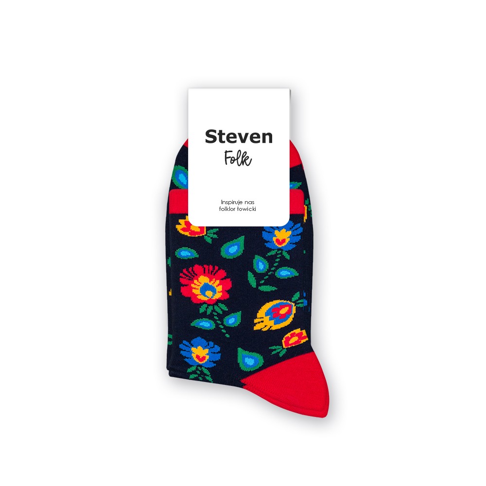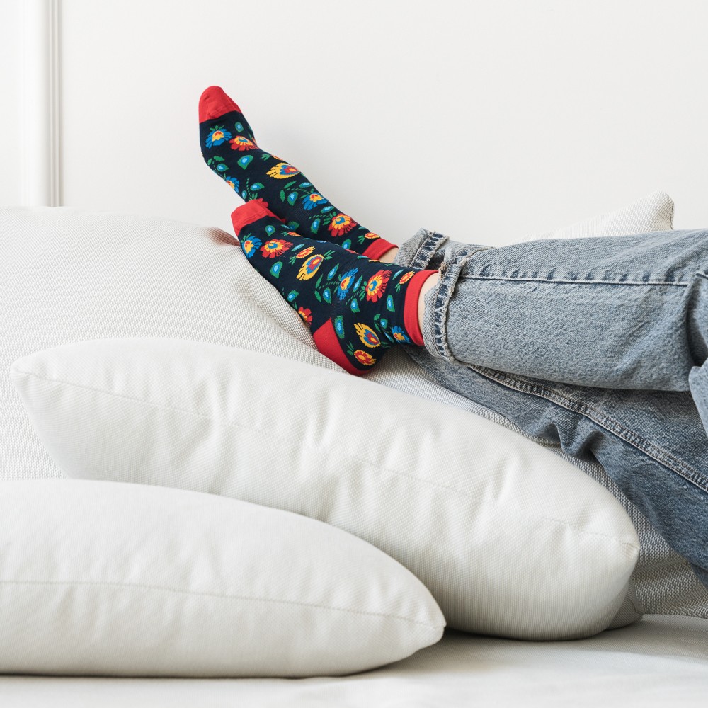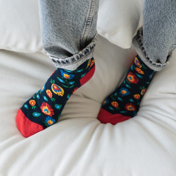 Wyróżnij się stylowo dzięki naszym bawełnianym skarpetkom damskim inspirowanym folkowym wzornictwem łowickim! Pokryte kolorowymi, kwiatowymi motywami w stylu wycinanki łowickiej, są hołdem dla polskiej tradycji w nowoczesnym, radosnym wydaniu. Miękka, przewiewna bawełna zapewnia komfort przez cały dzień, a intensywne kolory dodają energii każdej stylizacji – idealne do sneakersów, botków czy jako ciekawy akcent do domowego outfitu.