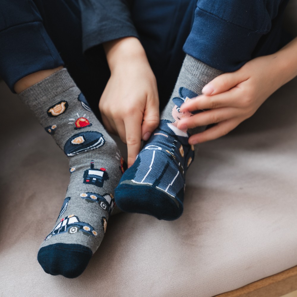 Dla wszystkich odważnych chłopców, którzy już dziś wiedzą, że w przyszłości zostaną stróżami prawa przygotowaliśmy specjalne policyjne skarpetki. Ta wesoła para „nie do pary” powstała z doskonałej bawełny i z pewnością poradzi sobie podczas niejednej trudnej akcji. Delikatna i jednocześnie wytrzymała przędza zapewnia odpowiednią przewiewność dziecięcym stópkom, a rodzicom daje gwarancję wysokiej jakości wykonania i odporności na przetarcia.