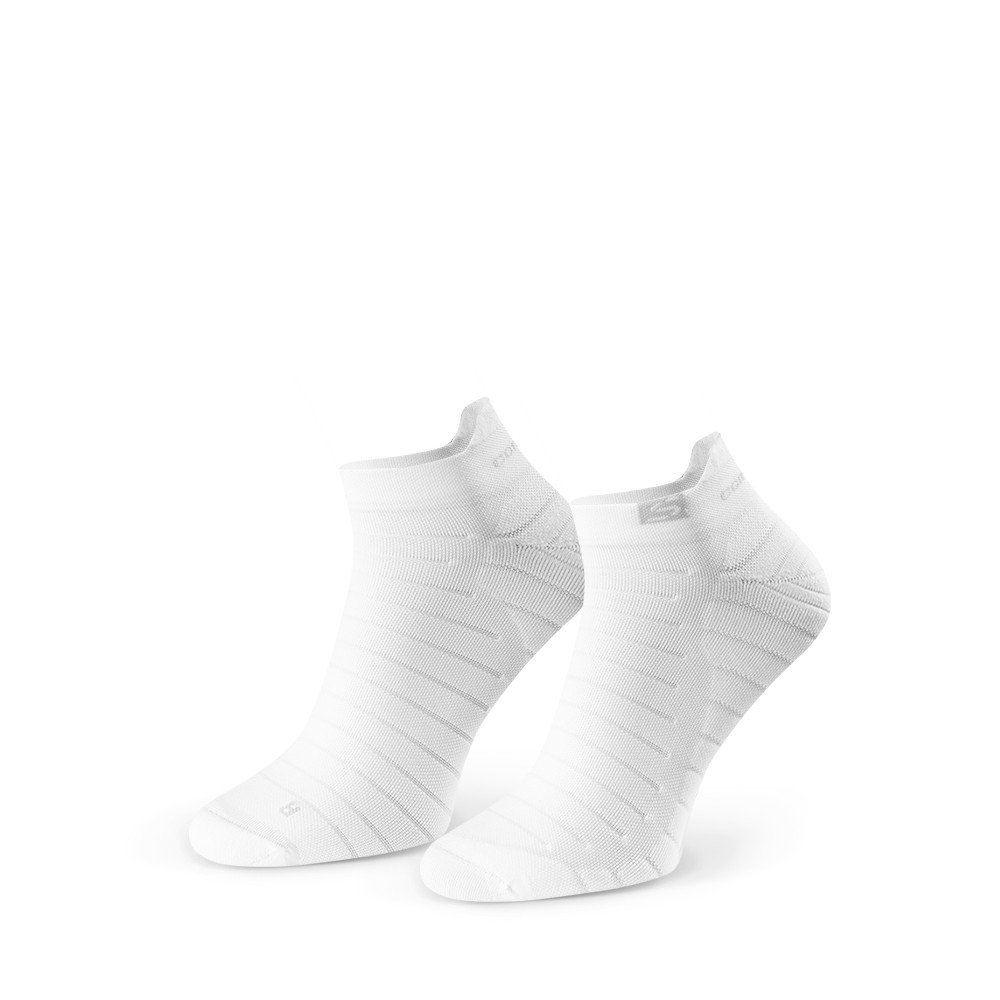 Stopki do biegania to produkt, który został zaprojektowany z myślą o wymagających treningach. Skarpety wyprodukowano z polipropylenu (68%) wzbogaconego lycrą z jonami srebra (27%) oraz z poliamidu (3%) i elastanu (2%). Polipropylen to materiał hydrofobowy, który nie wchłania wilgoci, lecz odprowadza ją na zewnątrz. Dzięki temu stopy pozostają suche nawet podczas intensywnego wysiłku. Jest jednym z najlżejszych włókien stosowanych w produkcji odzieży, co sprawia, że skarpety wykonane z tego materiału są niezwykle lekkie i wygodne. Produkt jest odporny na przetarcia oraz rozciąganie, co oznacza, że jest wytrzymały podczas użytkowania i dłużej zachowuje swoje właściwości. Materiał dobrze izoluje, zapewniając komfort cieplny zarówno w chłodnych, jak i ciepłych warunkach. Jony srebra posiadają naturalne właściwości bakteriobójcze i grzybobójcze, co zapobiega powstawaniu nieprzyjemnego zapachu oraz chroni przed infekcjami skórnymi. Produkt nie wywołuje reakcji alergicznych, co czyni go idealnym wyborem dla osób z wrażliwą skórą. Uczucie komfortu podczas treningów zapewniają: miękka frotta w stopie, bezszwowe łączenie i strefy oddychające.