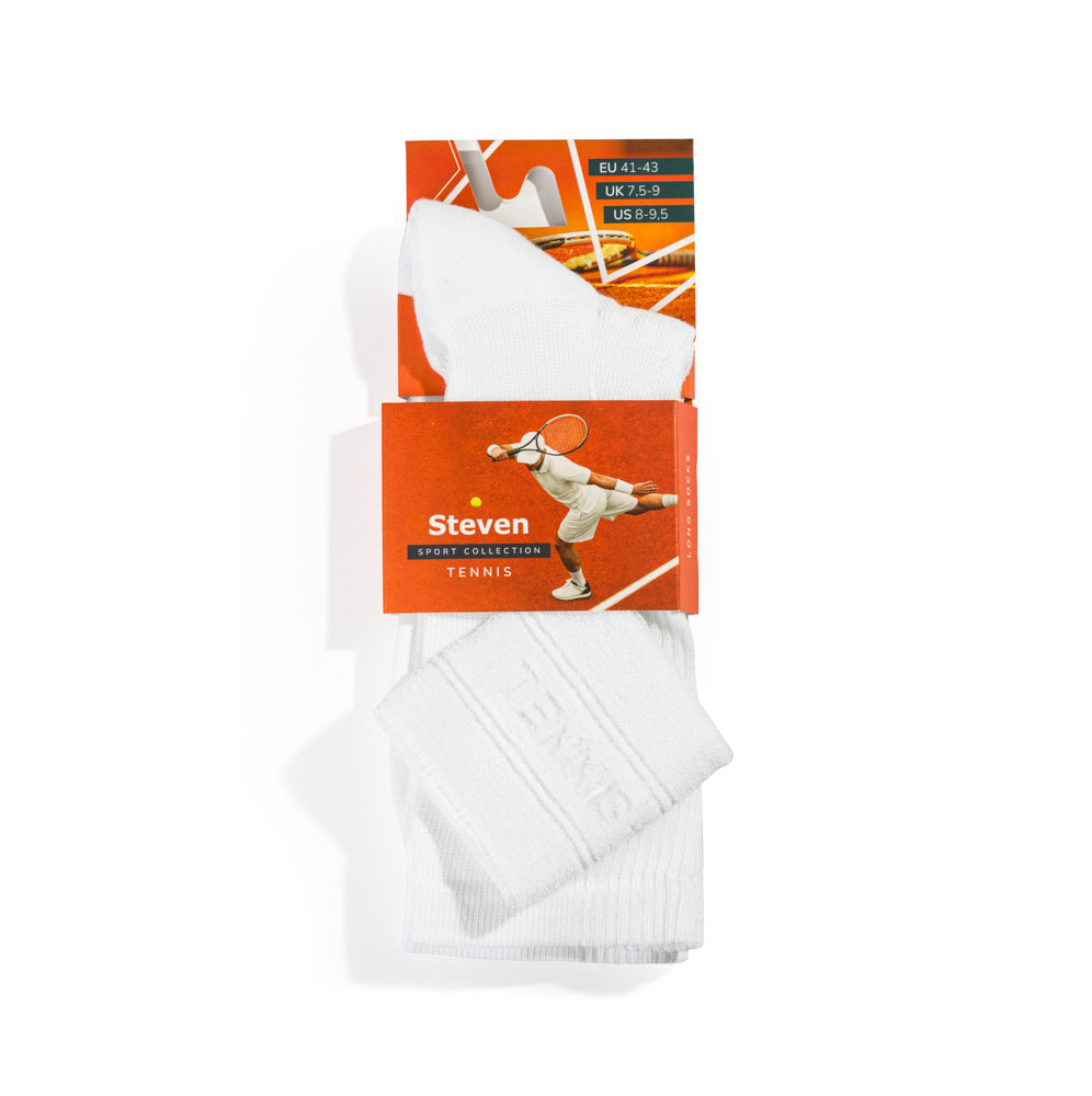 Skarpety do tenisa to produkt, który został zaprojektowany z myślą o wymagających treningach. Polecany dla osób początkujących, jak i zaawansowanych graczy. Skarpety wyprodukowano z materiału DRYTEX® COMFORT (80%) oraz lycry z jonami srebra (14%) z domieszką poliamidu (3%) i elastanu (3%). Skarpety skutecznie odprowadzają wilgoć, pozostawiając uczucie suchości i świeżości. Zaprojektowany model umożliwia swobodny przepływ powietrza, zapobiegając przegrzewaniu się stóp. Materiał z jonami srebra wykazuje działanie antybakteryjne i antyzapachowe. Skarpety są bezszwowe, dzięki czemu zmniejsza się ryzyko otarć. Ściągacz w śródstopiu stabilizuję skarpetę i zapobiega jej zsuwaniu podczas aktywności fizycznej. Na szczególną uwagę zasługuje ściągacz na wysokości łydki, którego anatomicznie dopasowuje się do nogi i nie powoduje nadmiernego ucisku. Skarpety wykonane z DRYTEX® COMFORT są bardziej trwałe i odporne na ścieranie niż tradycyjne skarpety bawełniane. W zestawie opaska frotte na nadgarstek, która zapobiega dostawaniu się potu na dłonie, co poprawia chwyt rakiety i zapobiega jej wyślizgiwaniu. Dodatkowo opaska minimalnie amortyzuje i stabilizuje nadgarstek podczas dynamicznych ruchów.