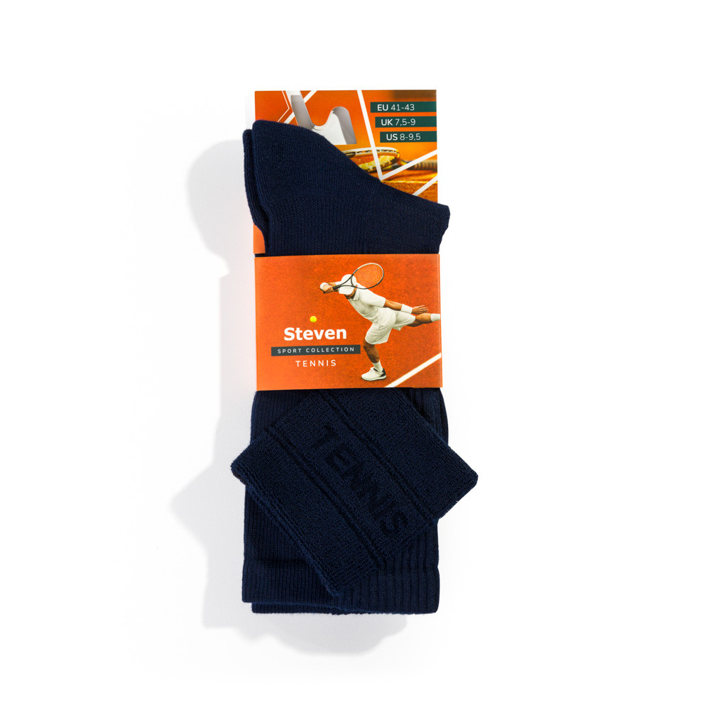 Skarpety do tenisa to produkt, który został zaprojektowany z myślą o wymagających treningach. Polecany dla osób początkujących, jak i zaawansowanych graczy. Skarpety wyprodukowano z materiału DRYTEX® COMFORT (80%) oraz lycry z jonami srebra (14%) z domieszką poliamidu (3%) i elastanu (3%). Skarpety skutecznie odprowadzają wilgoć, pozostawiając uczucie suchości i świeżości. Zaprojektowany model umożliwia swobodny przepływ powietrza, zapobiegając przegrzewaniu się stóp. Materiał z jonami srebra wykazuje działanie antybakteryjne i antyzapachowe. Skarpety są bezszwowe, dzięki czemu zmniejsza się ryzyko otarć. Ściągacz w śródstopiu stabilizuję skarpetę i zapobiega jej zsuwaniu podczas aktywności fizycznej. Na szczególną uwagę zasługuje ściągacz na wysokości łydki, którego anatomicznie dopasowuje się do nogi i nie powoduje nadmiernego ucisku. Skarpety wykonane z DRYTEX® COMFORT są bardziej trwałe i odporne na ścieranie niż tradycyjne skarpety bawełniane. W zestawie opaska frotte na nadgarstek, która zapobiega dostawaniu się potu na dłonie, co poprawia chwyt rakiety i zapobiega jej wyślizgiwaniu. Dodatkowo opaska minimalnie amortyzuje i stabilizuje nadgarstek podczas dynamicznych ruchów.