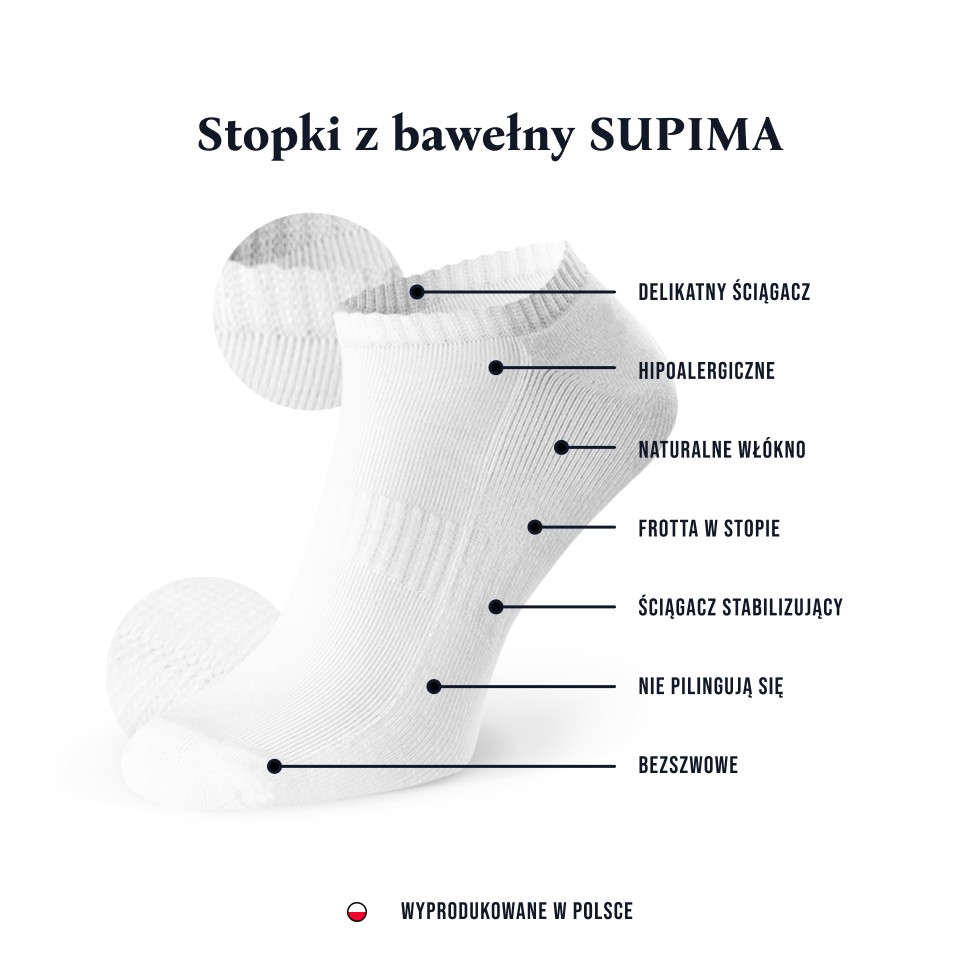 Stopki zostały wykonane z najwyższej jakości bawełny amerykańskiej SUPIMA®. Dłuższe włókna tego surowca sprawiają, że ten rodzaj skarpet charakteryzuje się niezwykłą miękkością i wytrzymałością. Skarpety z bawełny SUPIMA® są odporne na pilingowanie. Model do kostki posiada frottę w stopie, a ściągacz w śródstopiu stabilizuję skarpetę podczas noszenia w obuwiu. Komfort noszenia zapewniają delikatny ściągacz i bezszwowe łączenie.