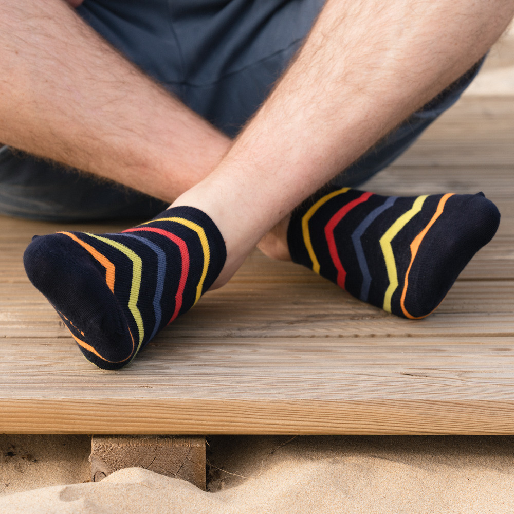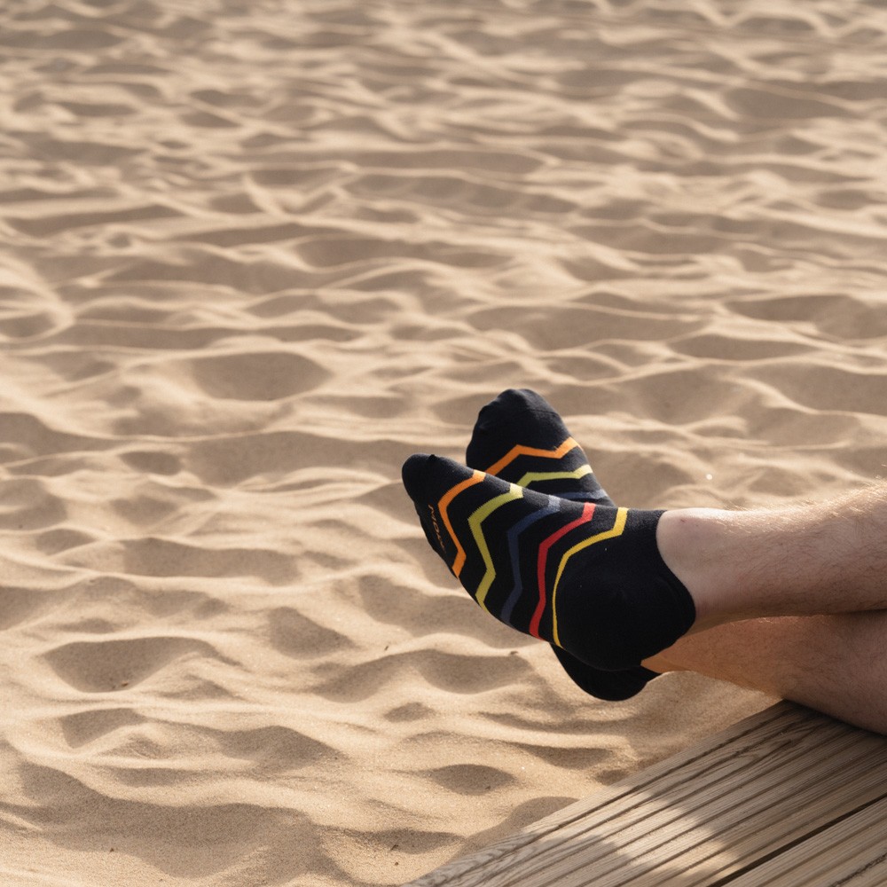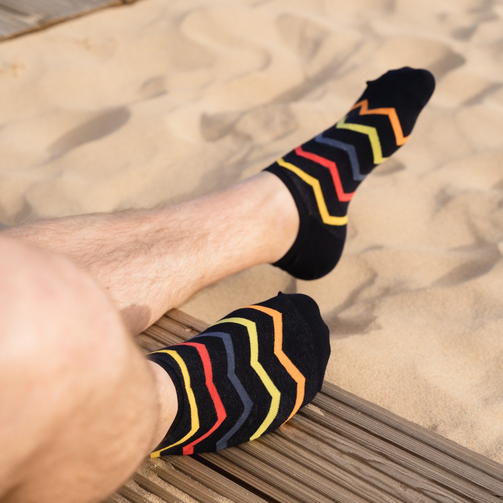 ZIGZAG MORE to doskonałej jakości bawełniane skarpetki dla tych, którzy wiedzą, że w życiu nie zawsze jest prosto. Tak to już jest na tym świecie, że po wzlotach przychodzą upadki i cała zabawa zaczyna się od początku. Trzeba o tym pamiętać, nie poddawać się niepowodzeniami i uparcie wspinać na kolejne szczyty, bo przecież "co nas nie zabije to nas wzmocni".