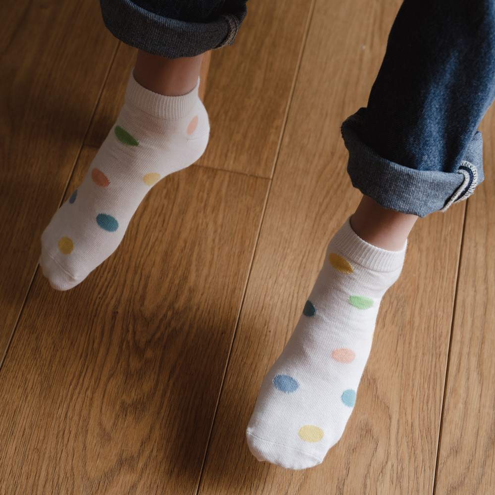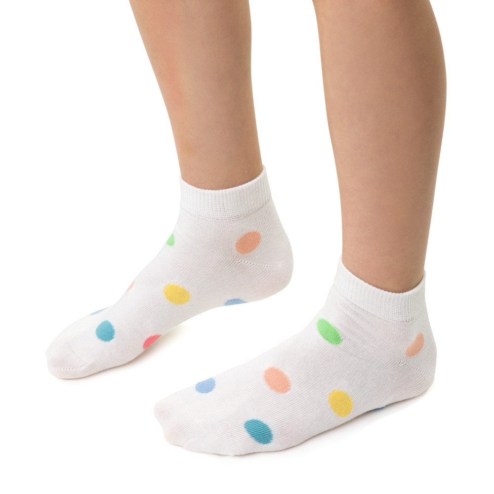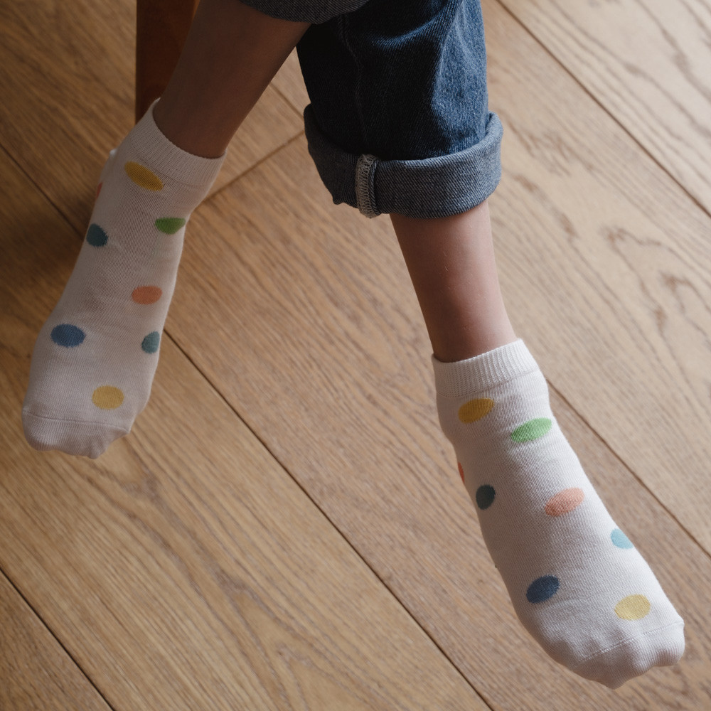 Nasze bawełniane skarpetki do kostki to idealny wybór dla małych miłośniczek wygody i kolorowych wzorów. Wykonane z miękkiej, oddychającej bawełny, zapewniają komfort noszenia przez cały dzień. Uroczy wzór w kolorowe kropki doda radości każdej stylizacji, a elastyczny ściągacz sprawi, że skarpetki pozostaną na swoim miejscu bez ucisku. Doskonałe do codziennych zabaw, przedszkola czy spacerów.