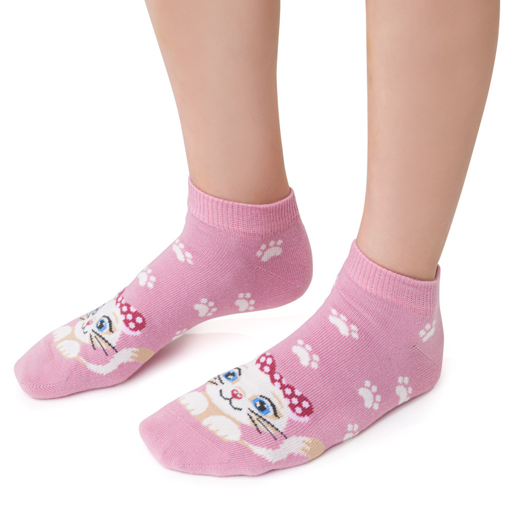 Nasze bawełniane skarpetki do kostki to idealny wybór dla małych miłośniczek wygody i kolorowych wzorów. Wykonane z miękkiej, oddychającej bawełny, zapewniają komfort noszenia przez cały dzień. Uroczy wzór z kotkiem doda radości każdej stylizacji, a elastyczny ściągacz sprawi, że skarpetki pozostaną na swoim miejscu bez ucisku. Doskonałe do codziennych zabaw, przedszkola czy spacerów.